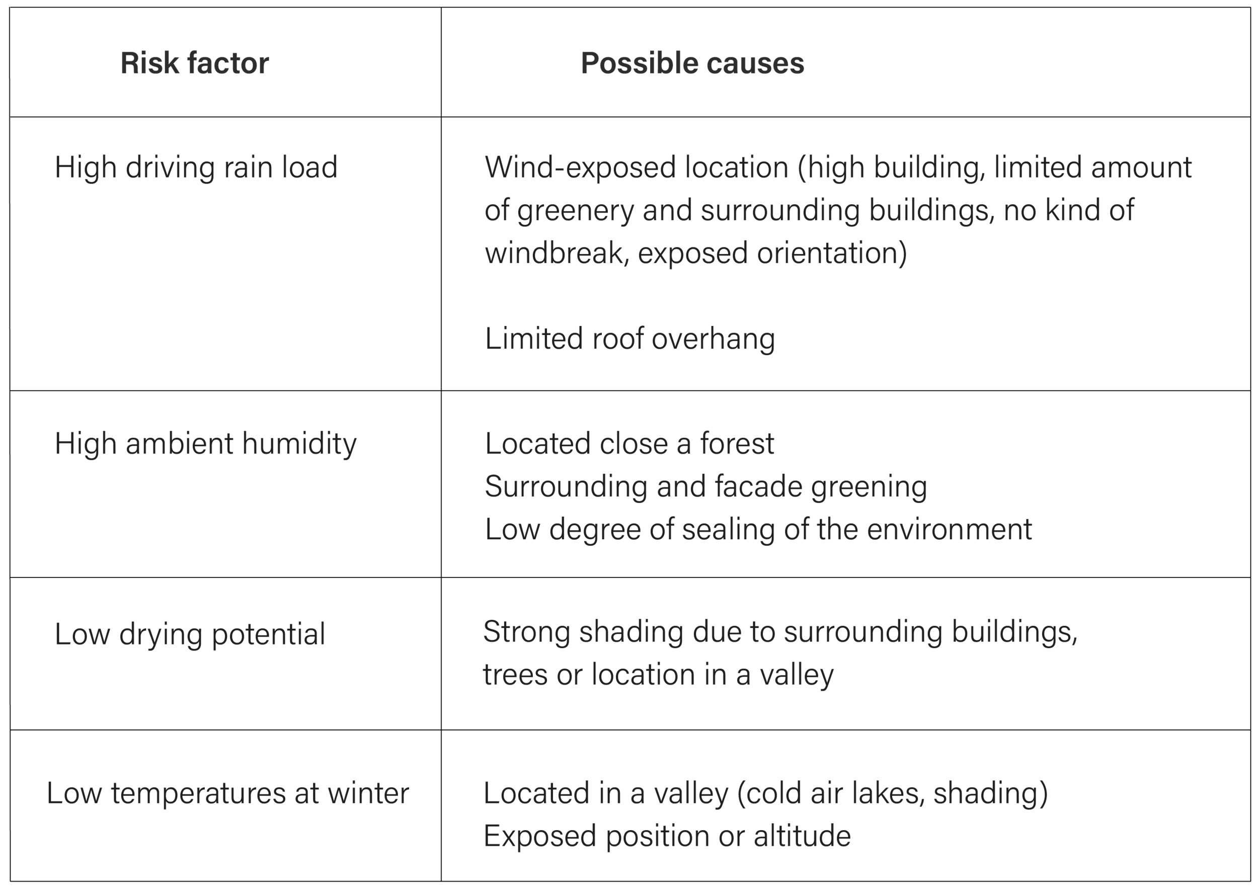 In addition to the large-scale classification of the location, it may be useful to investigate the local climate more closely. Risk factors result from local differences in driving rain, the humidity level of the outside air and the drying potential due to solar radiation. Risk factors and associated possible causes are illustrated in Table 4‑12. Other aspects are also relevant, listed in Table 4‑13.