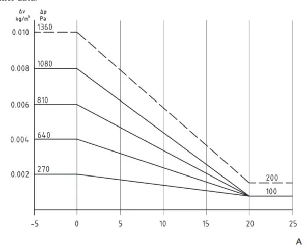 Figure 4–38: Simplified approach to determine the internal humidity class of a building as proposed in Annex A of EN ISO 13788 (ISO 13788, 2012): the indoor outdoor vapour pressure difference (Δp [Pa]) and difference between outdoor and indoor moisture content (Δv [kg/m3]) is given as a function of the monthly mean outdoor air temperature (A) for different classes of buildings, ranging from very dry storage buildings (class 1) to very wet special buildings such as breweries, swimming pools etc. (class 5).