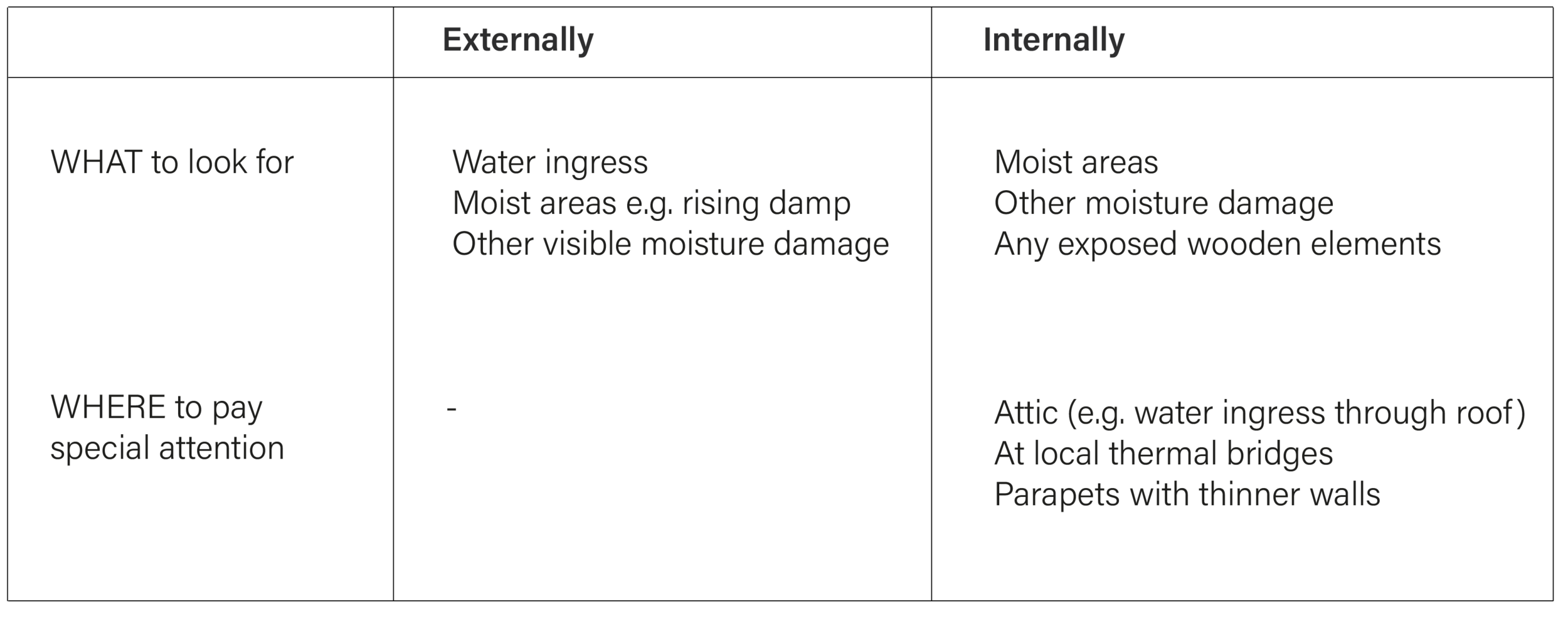 As the wooden elements at risk in historic constructions are mainly embedded wooden parts, it will in most cases not be possible visibly to detect wood decay. This includes e.g. embedded wooden beam ends, half timbering and wooden framing for insulation systems. Therefore, wood in the construction and possible excess moisture in the construction should be detected. Moisture in the construction in general is described in Section 4.2.2. Table 4‑6 sums up what to look for, and where to pay special attention with regard to wood rot.